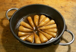Второе место в рейтинге популярности овощей в Германии занимают корнеплоды — морковь и свёкла (10,7 кг в год), третье — репчатый лук (8,7 кг)[291][292]. Свёкла известна немцам преимущественно консервированной[293] целиком[294] или дольками[295] — отваренной и маринованной в уксусе с пряностями — и популярна на севере страны: её добавляют в салаты, без неё не обходится гамбургский лабскаус[296]. Германия располагает самыми большими в мире площадями по выращиванию кольраби, немцы являются и чемпионами мира по её поеданию. Немецкое название овоща «капустная репа»[297] заимствовано помимо русского ещё английским и японским языками, а сам весенний овощ считается «типично немецким»[298][299]. Из кольраби немцы любят готовить салат с морковью и редисом, а также загущённый мукой пюреобразный гарнир, запеканки и вегетарианский шницель в панировке[300][301]. В Бранденбурге из местного сорта менее известного корнеплода турнепса готовят «тельтовские репки», тушенные в сливочном масле с карамелизированным сахаром[302], слава которых докатилась до Франции[259]. Этот деликатес известен в Германии с XVII века, репки из Тельтова заказывал себе в Кёнигсберг И. Кант[303], а И. В. Гёте в Веймар их присылал друг-музыкант К. Ф. Цельтер[304]. На юге Германии редьку подают с брецелями или хлебом с маслом на закуску к пиву[305][306]. Некогда популярная брюква сдала свои позиции в рационе немцев картофелю и чётко ассоциируется с голодом в военное лихолетье: зима 1917 года вошла в историю страны как брюквенная[307]. С припускания репчатого лука в немецкой кухне начинается процесс приготовления многих блюд[308], кроме того из лука немцы готовят пирог, а в Сааре, Пфальце и Бадене — и тарт фламбе. В Германии также готовят луковые супы: пфальцский луковый, на основе ру с белым вином и сливками[309], или рейнский луковый, с гаудой и меттвурстом[310].
