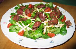 Более половины современных немцев употребляют в пищу только мышечную ткань животных и отказываются от блюд из субпродуктов, которые вызывают у них отвращение[18][98], что, с точки зрения Марина Тренка, также является следствием распространения в стране вегетарианства[13]. Предполагается, что христиане пренебрегали внутренностями животных в питании потому, что их ценили древнеримские язычники для предсказаний будущего. В Средние века, когда мясо появлялось на столе только по особым случаям, в пищу употреблялась вся туша животного: сердце, лёгкие, мозги, желудок, вымя, диафрагма и даже кровь. День забоя свиньи в немецких домохозяйствах стал особым событием, его венчал праздничный обед — шлахтфест из традиционных блюд преимущественно из субпродуктов: отварного «котлового мяса» и «забойного блюда» — мясного ассорти с различными видами свежеприготовленных колбас[99]. Оригинальная гастрономическая традиция праздничного застолья по поводу забоя свиньи во франконском Швайнфурте с семью сменами блюд сложилась более полутора веков назад[100][101]. На севере страны помимо многочисленных видов кровяных колбас готовили «чёрно-кислую подливку», а на юге — «шваас», запечённую кровь со шпигом, чёрствой булкой и майораном[102][103]. Ещё на рубеже XIX—XX веков блюда из субпродуктов, например, телячья зобная железа в ракушках и копчёный бычий язык, могли присутствовать в свадебном меню, что совершенно немыслимо в современной Германии. Блюда из субпродуктов сохранились в региональных кухнях Германии, преимущественно на юге страны[104], но и там молодое поколение уже не станет есть потроха[105].