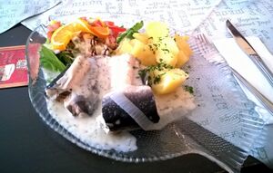 Наибольшим спросом на рынке рыбной продукции в современной Германии пользуются минтай (19,3 %), лосось (17,3 %), тунец (12,4 %), сельдь (8,9 %) и креветки (7,7 %)[151]. Две трети потребляемой немцами рыбной продукции составляет морская рыба[159]. Долгое время в Германии главенствовала сельдь, торговля которой не в последнюю очередь способствовала расцвету Ганзы. Сельдь солили, коптили, мариновали, жарили в панировке и без[160], варили, тушили или запекали в золе. Пепельная среда, когда по традиции едят рыбу, называлась «днём сельди»[161][162]. Жареная сельдь якобы исцелила Мартина Лютера от тяжёлой болезни быстрее врачей[163]. Спрятавшись в сельдяной бочке, бежала из Нимбшенского монастыря в Гримме его будущая супруга Катарина фон Бора[164]. Ценителем маринованной сельди среди знаменитостей был «железный канцлер», давший имя одному из типичных немецких рыбных продуктов — сельди «Бисмарк»[165]. На плакатах перед Второй мировой войной маринованная и копчёная сельдь провозглашалась «немецкой народной пищей»[166], тогда это был доступный повседневный продукт питания, который обычно ели с жареной картошкой, квашеной капустой и хлебом. «Селёдочный картофель» — прослоенная солёной сельдью картофельная запеканка, блюдо рейнской кухни[167]. В послевоенные годы консервированные филе сельди в томатном соусе, сардины в масле и жареная сельдь в маринаде считались дешёвой студенческой едой, но в современной Германии на лов рыбы действуют ограничения, и сардины и сельдь поднялись на уровень деликатесов и выросли в цене. Ныне лучшие рестораны Гамбурга предлагают блюда высокой кухни из сардин[168], а федеральный канцлер Ангела Меркель угощала маринованной сельдью «Бисмарк» высокопоставленных гостей. Рыбные булочки с филе маринованной сельди, сервированным с репчатым луком на листе салата, обычно продаются в киосках уличного фастфуда. Селёдочный салат в Германии обычно готовят с яблоком и варёным яйцом и заправляют майонезом со сливками, он бывает «белым»[169][170] и «красным», если ещё и со свёклой. Такой селёдочный салат со свёклой по маминому рецепту — любимое блюдо в сочельник у премьер-министра Баварии Маркуса Зёдера[171]. Из филе маринованной сельди скручивают рольмопсы с маринованным огурцом — и это уже популярное средство от похмелья[172].