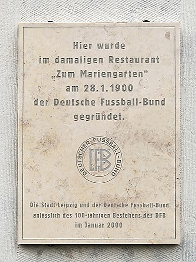 Немецкий футбольный союз (нем. Deutscher Fußball-Bund) был основан 28 января 1900 года в Лейпциге представителями 86 клубов. Голосование, проведённое для создания ассоциации, было 62:22 в пользу (84 голоса). Некоторые делегаты представляли более одного клуба, но, возможно, голосовали только один раз. Другие присутствующие делегаты не имели полномочий своего клуба для участия в голосовании. Фердинанд Гюппе, представитель «ДФК Прага», был назван первым президентом[4]. В память об этом историческом событии была установлена мемориальная доска на фундаментном здании на нынешней улице Бюттнерштрассе, недалеко от главного железнодорожного вокзала. Немецкий футбольный союз объединил большое количество региональных соревнований, проводимых на уровне земель Германии, в единый признанный национальный титул на сезон 1902/03. Немцев не было в Париже, когда ФИФА была основана семью странами в мае 1904 года, но к тому времени, когда устав ФИФА вступил в силу 1 сентября, Германия присоединилась к нему по телеграмме в качестве восьмой страны. Сборная Германии провела свою первую игру в 1908 году.