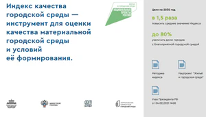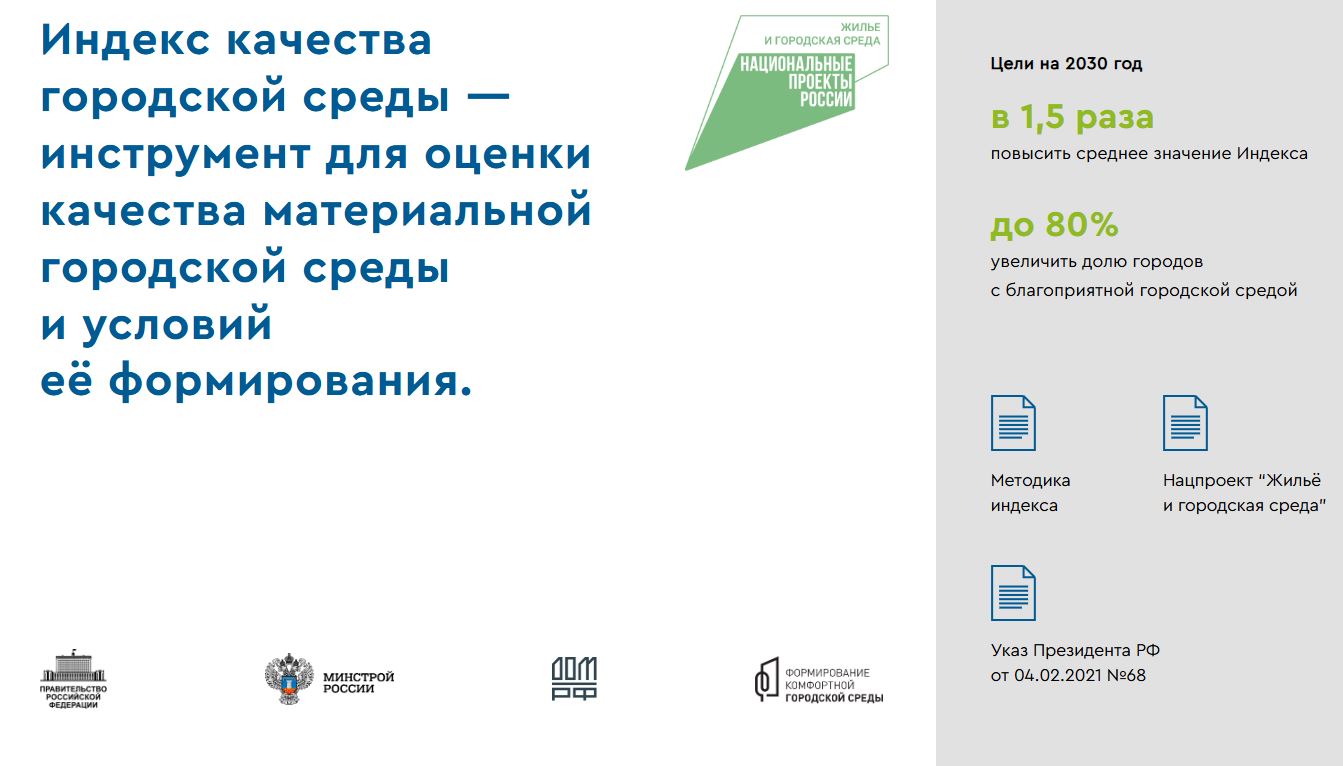 - индекс качества городской среды: ежегодный инструмент мониторинга состояния более 1110 городов России, который формируется Министерством строительства и жилищно-коммунального хозяйства Российской Федерации (Минстроем России). Оценка производится по 36 социально-экологическим индикаторам, которые позволяют оценить безопасность, комфорт, экологичность и разнообразие досуга в городской среде. Данный индекс имеет высокую практическую значимость, так как его значения напрямую влияют на распределение субсидий из федерального бюджета на программы благоустройства в рамках национального проекта «Жильё и городская среда»[33];