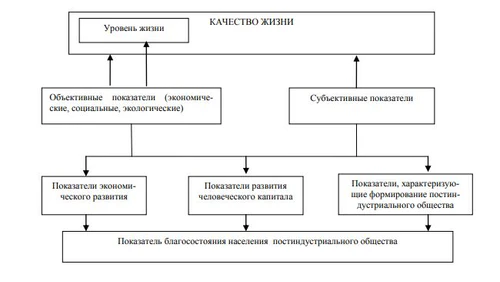 - cубъективные показатели базируются на самооценке граждан. Они отражают внутреннее состояние человека: степень личной удовлетворённости жизнью, психоэмоциональное состояние и уровень социального оптимизма[2][3].