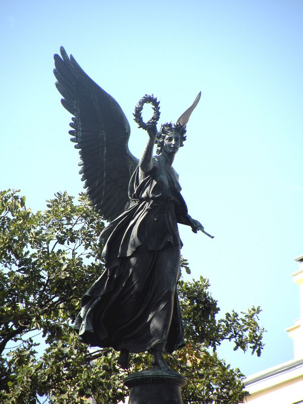 Вход на Конногвардейский бульвар, названный в честь одного из славных полков русской гвардии, оформляют две гранитные колонны с изображением крылатой богини победы Ники — работа выдающегося немецкого скульптора К. Д. Рауха.