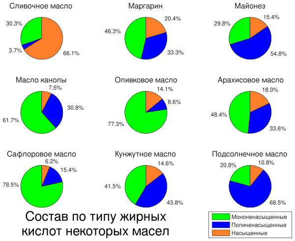 Содержание разных жирных кислот в некоторых маслах и жирах приведена на рисунке.