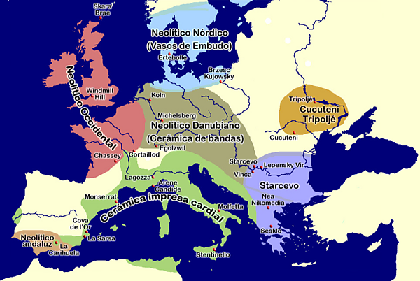 Культура неолита проникла в Европу из Анатолии (по другому мнению — с Ближнего Востока по морю, через греческие острова[3]). Все животные и растения, которых разводили европейцы неолита, были одомашнены на западе Азии. За 2500 лет, с 6500 до 4000 года, носители новой культуры заселили практически всю Европу, за исключением горных кряжей, берегов Балтики и Среднедунайской низменности. На побережье Атлантики они долгое время соседствовали с более ранними носителями мезолитических культур. До 5 тыс. до н. э. население Европы постоянно росло, затем произошёл кризис перенаселения, продолжавшийся 1500 лет. Начиная с 3,5 тыс. до н. э. рост вновь возобновился.