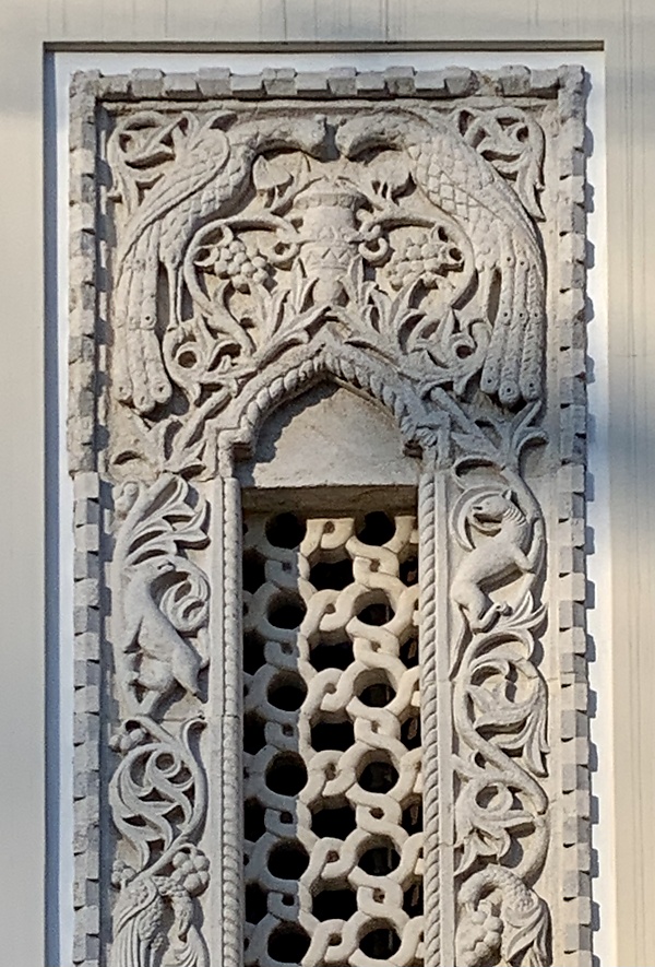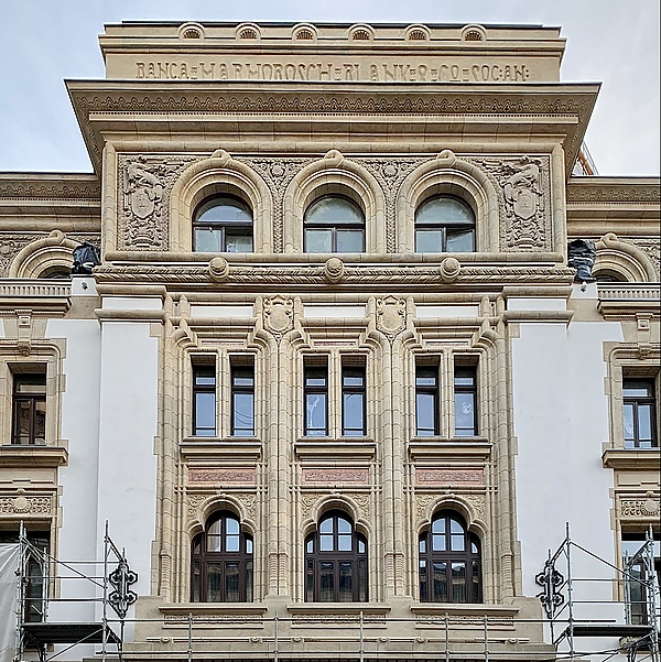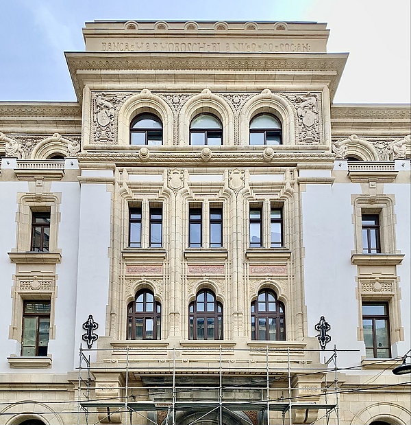 Рельефы сочетают в себе национальное вдохновение (молдавские оконные орнаменты, капители и балюстрады в стиле брынковянск и т. д.) с элементами символического европейского геральдического репертуара (щиты, драконы, орлы, грифоны, раковины и т. д.); а также традиционные формы проёмов, трёхлопастные или в виде скобок/кокошников, смешанные с другими, полукруглые, отступающие порталы, романских или ренессансных пропорций и профиля и т. д.. Этот подход не полностью ограждает сооружения от эклектизма, но ансамбль склоняется в сторону национального колорита[17].