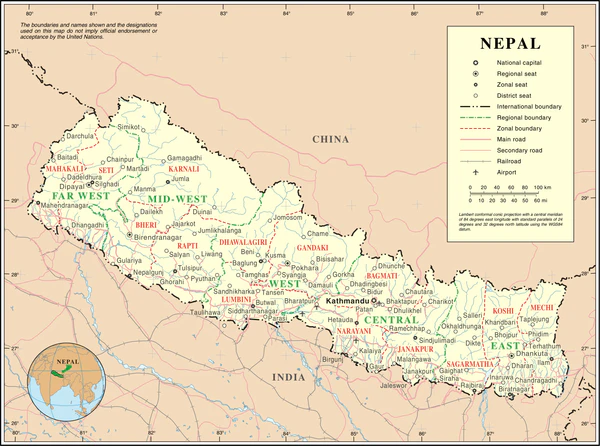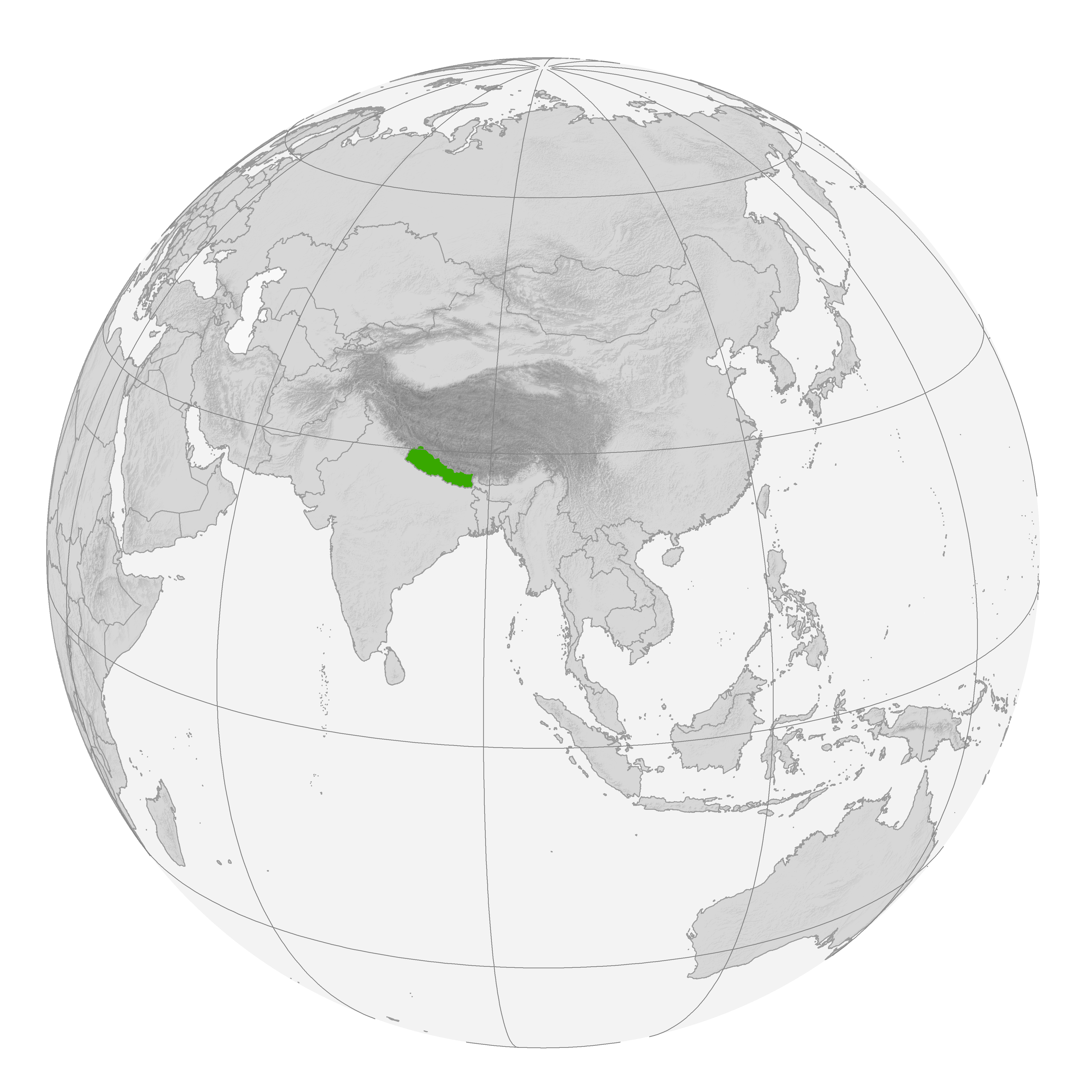 Республика Непал расположена в Азии между 26° и 30° северной широты и между 80° и 88° восточной долготы. Протяжённость с севера на юг — около 250 км, а с востока на запад — около 800 км.
