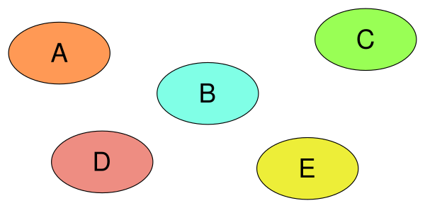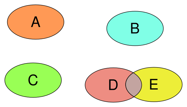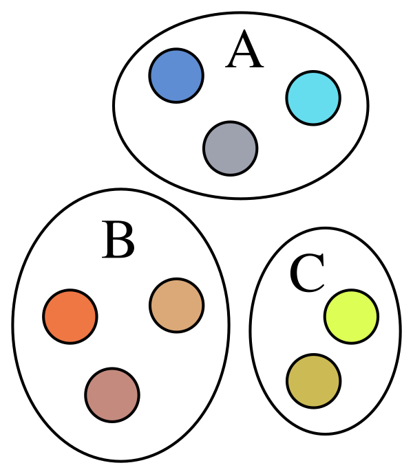 Разбиение множества X — это любой набор взаимно дизъюнктных множеств, объединение которых равно X[8]. Любое разбиение можно эквивалентно описать отношением эквивалентности, бинарным отношением, определяющим, принадлежат два элемента одному и тому же множеству в разложении или нет[8]. Системы непересекающихся множеств[9] и измельчение разбиения[10] — две техники в информатике для эффективной работы с разбиениями набора объектов, соответственно, для операции объединения, которая сливает вместе два множества, и операции измельчения, которая разбивает одно множество на два.