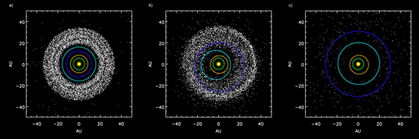 Другая гипотеза (т. н. гипотеза миграции) заключается в том, что Уран и Нептун сформировались ближе к Солнцу, где плотность материи была выше, и впоследствии переместились на нынешние орбиты[111]. Преимуществом данной гипотезы является её способность объяснить населённость «транснептуновой» области Солнечной системы многочисленными малыми телами[112]. В настоящее время наиболее широко распространена конкретная версия этой гипотезы, известная как модель Ниццы, которая описывает влияние мигрирующего Нептуна и других планет-гигантов на структуру пояса Койпера[113].