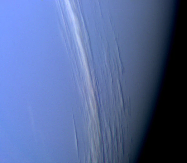 В августе 2024 года НАСА впервые опубликовало фото, которое «Вояджер-2» сделал ещё 25 августа 1989 года (одно из последних перед тем, как зонд покинул орбиту Нептуна)[79]. Снимок сделан в ложных цветах с помощью светофильтров, пропускающих излучение той длины волны, на которой метан поглощает свет. На фото метан выглядит тёмно-синим, но при этом даёт полупрозрачную дымку на всей планете. Ярко-красное свечение вокруг Нептуна вызвано рассеянием солнечного света на больших высотах[80][81].