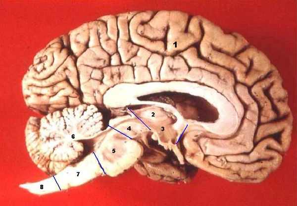 В головном мозге различают несколько отделов: продолговатый мозг; задний, включающий в себя мост, мозжечок и эпифиз; средний; промежуточный; и передний мозг, представленный большими полушариями.