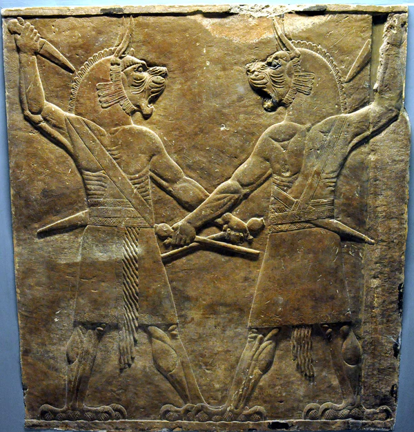 - «Лев-демон» угаллу (аккад. ugallu, от шум. «Великий День(-демон)»)[87]) — также «человек-лев»[85]. На старовавилонских печатях часто изображён держащим за ногу человека или животное, висящее вниз головой; ассоциирован с богом, вооружённым изогнутым мечом — Нергалом или другим божеством, связанным со смертью[85]. На одной из старовавилонских печатей, принадлежавшей служителю бога Лугальгудуа (то есть Нергала), угаллу изображен с ножом в одной руке и отрезанной человеческой головой — в другой[85]. Вместе с тем, угаллу известен и как дух с защитными функциями[87].