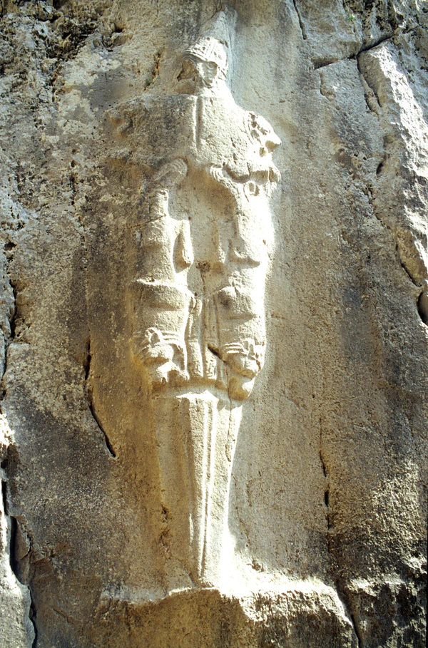 Нергал часто сравнивается или воплощает образ льва: «с поднятыми лапами, гневно неистовствующий, тот, что точит зубы против своего врага»[18]. В русле этой иконографической традиции выполнено изображение присевшего льва, посвященное «могучему льву», Нергалу Апиакскому[18]. Известно украшение в виде двух львов на рукояти меча, посвященного богу города Хубшалум (Нергалу), а также близкое по символике изображение «Бога-меча» из Язылыкая[18] (на иллюстрации).