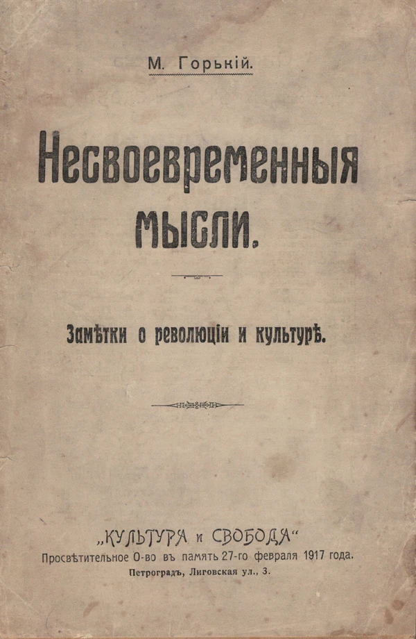 После Февральской революции в социал-демократической газете «Новая жизнь», главным редактором которой был Горький, начинает публиковаться авторская колонка «Несвоевременные мысли». После Октябрьской революции усиливаются расхождения во взглядах большевиков и редакции газеты, усиливается критика советской власти, что разворачивает полемику с «Правдой». Горького обвиняли в том, что он «заговорил языком врагов рабочего класса», и предлагали ему признать, что «многие из „мыслей“, высказывающихся им ранее, были, действительно, „несвоевременными“». Горький продолжил полемику, что привело к закрытию «Новой жизни». После этого общество «Культура и свобода», организованное Горьким, выпустило книгу «Несвоевременные мысли», содержащую 48 перепечатанных из «Новой жизни» статей без указания дат и названий.
