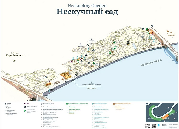 Нескучный сад обладает развитой инфраструктурой для отдыха и досуга посетителей. На всей территории парка обеспечено освещение в тёмное время суток, расставлены скамейки и оборудованы санитарные зоны. Для удобства посетителей работают несколько объектов питания, для маломобильных граждан созданы условия доступности. Среди объектов инфраструктуры по занятиям выделяют[1][2]: