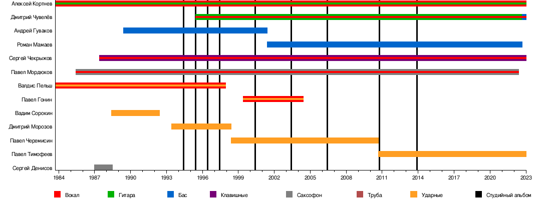 | Алексей Кортнев | вокал, акустическая гитара, электрогитара, бубен, трещотка, автор песен | 1983—настоящее время | |