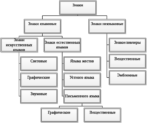 - Знаки общения делятся на знаки естественных языков и искусственных знаковых систем — искусственных языков[8]