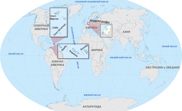 Нидерла́нды (нидерл. Nederland [ˈneːdərlɑnt], нидерландское произношение ) — государство, состоящее из основной территории в Западной Европе и островов Бонайре, Синт-Эстатиус и Саба в Карибском море (называемых также Карибскими Нидерландами). В Западной Европе территория омывается Северным морем (длина береговой линии — 451 км) и граничит с Германией (577 км) и Бельгией (450 км). Вместе с островами Аруба, Кюрасао и Синт-Мартен, имеющими особый статус (самоуправляемое государственное образование), Нидерланды входят в Короле́вство Нидерла́ндов (нидерл. Koninkrijk der Nederlanden). Отношения между членами королевства регулируются Хартией Королевства Нидерландов, принятой в 1954 году.