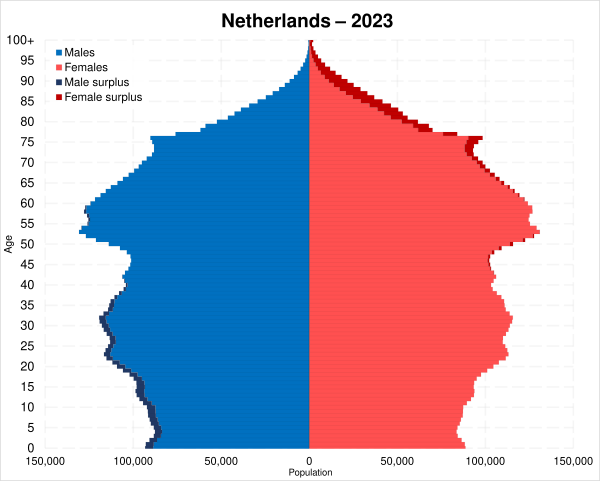 Средний возраст населения Нидерландов согласно данным The World Factbook на 2020 год составил 42,8 года (32-е место в мире), в том числе, 41,6 года у мужчин и 44 года у женщин[26]. Население Нидерландов является самым высоким в мире: средний рост взрослых мужчин — 182,5 см, взрослых женщин — 168,7 см.
