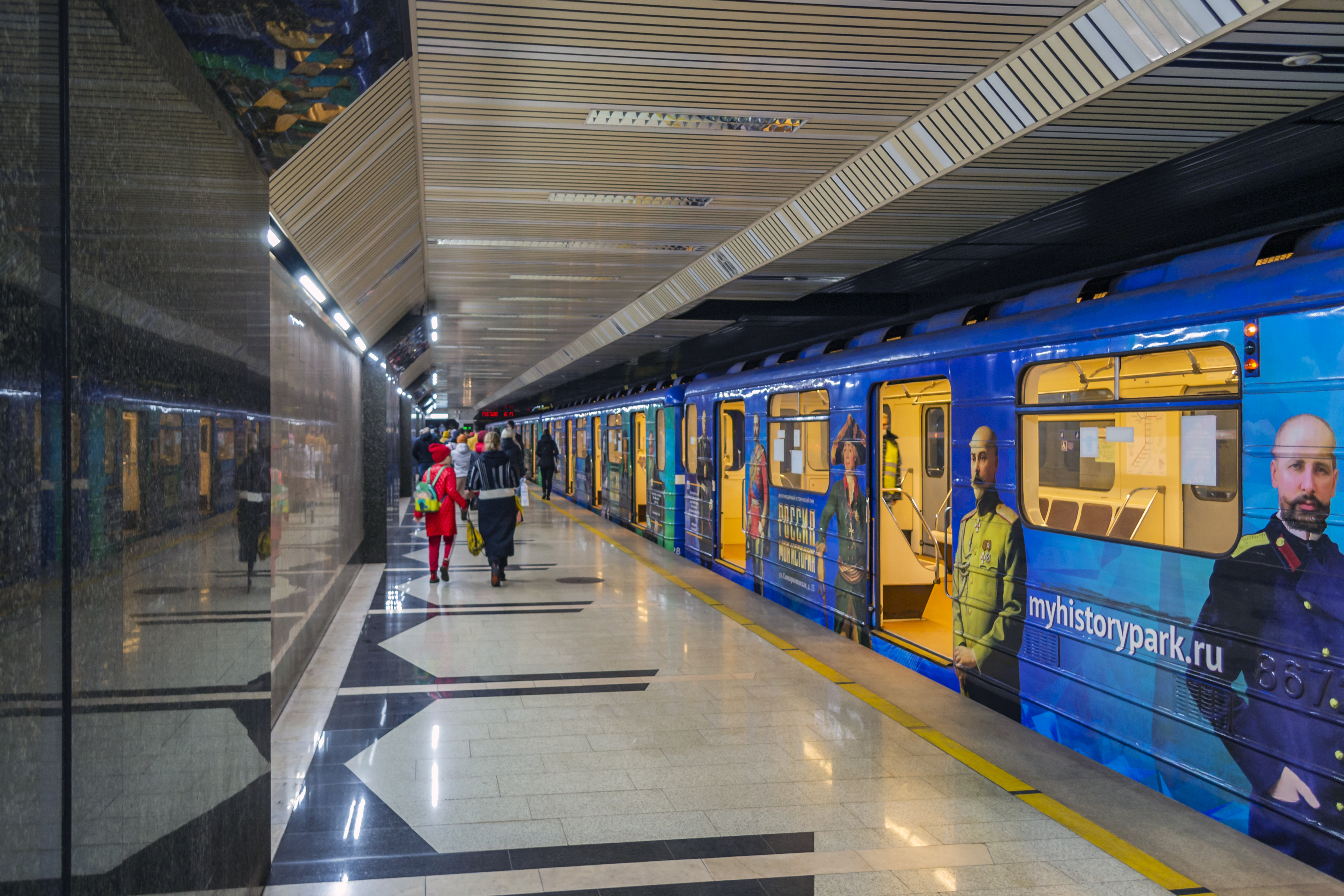 - «Стрелка», поезд с фотографиями строительства станции метро «Стрелка», в головных вагонах.