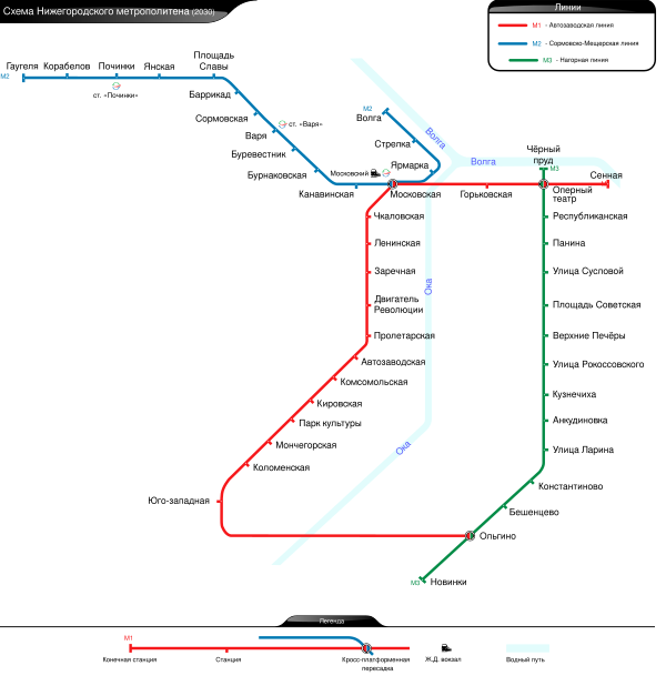 Примечание: На Автозаводской линии организовано правостороннее движение, на Сормовско-Мещерской линии — левостороннее.