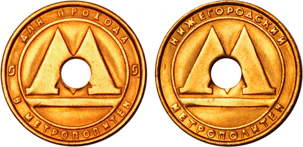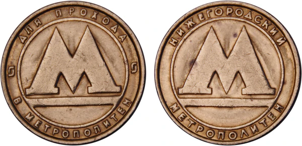 После распада Советского Союза в нижегородском метрополитене, как и в других городах, для оплаты проезда были введены специальные жетоны. Жетоны петербургского и нижегородского метрополитенов имели схожие технические данные, нижегородские жетоны принимались петербургскими турникетами, петербургские — нижегородскими. Из-за разницы в цене (в Санкт-Петербурге стоимость поездки всегда была выше, чем в Нижнем Новгороде) постоянно наблюдался отток нижегородских жетонов в Санкт-Петербург; с целью предотвратить отток было введено ограничение на продажу до 4 штук в одни руки. Но этими мерами отток предотвратить не удавалось, и с 28 декабря 2009 года в Нижнем Новгороде были введены жетоны с новыми техническими данными. Новые жетоны изготавливаются из старых путём пробивки отверстия по центру, что приводит к изменению веса жетона[26].