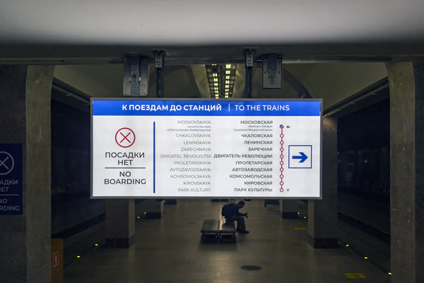 - По прибытии на конечную станцию объявление такое: «Станция „Буревестник“. Поезд дальше не идёт. Burevestnik station. The train terminates here. Уважаемые пассажиры! При выходе из вагона не забывайте свои вещи. Счастливого вам пути!».