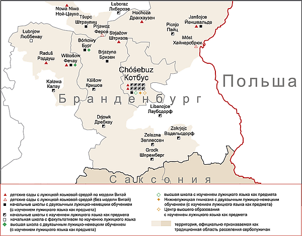 В соответствии с «Законом о правах лужицких сербов / вендов в Бранденбурге» от 7 июля 1994 года, в область расселения бранденбургских серболужичан, в которой до нашего времени сохраняется преемственность культурной и языковой традиции серболужичан и обеспечиваются права нижнелужицкого языка[26], входят: