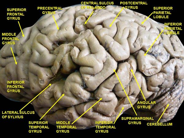 Левая нижняя лобная извилина играет важную роль в понимании и производстве речи. У людей с повреждениями в центре Брока может развиться моторная афазия Брока, при которой наблюдаются нарушения моторной функции речи. Центр Брока располагается в задней части нижней лобной извилины левого полушария и соответствует цитоархитектоническим полям Бродмана 44 и 45. Поле 44 отвечает за моторное производство речи, тогда как поле 45 отвечает за распознавание семантики слов. Афазия Брока характеризуется тем, что при сохранении относительно хорошего понимания чужой речи, у больного может наблюдаться аграмматичная речь, трудности с произношением слов, плохая артикуляция[3].