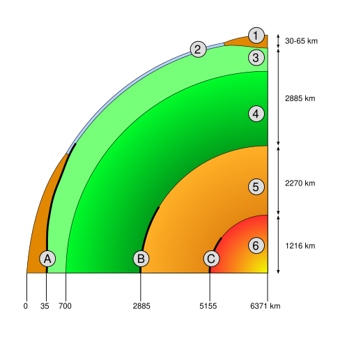 Под нижней мантией находится граница Гуттенберга — граница между мантией и внешним ядром, характеризующаяся скачкообразным падением скорости продольных волн с 13,6 до 8,1 км/с и исчезновением поперечных волн[3].