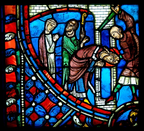 Согласно одному из преданий, св. Никасий в 407 году предвосхитил нашествие вандалов. Когда враги были у ворот города, св. Никасий вышел к ним, чтобы приостановить их продвижение и дать горожанам возможность скрыться. Он погиб от меча либо в алтаре, либо у входных дверей. По преданию, перед убийством св. Никасий читал псалом 118. Его глава, усеченна на словах «Прильпе земли душа моя…» (adhaesit pavimento anima mea), продолжила по усечении «…живи мя по словеси Твоему» (Vivifica me Domine secundum verbum tuum). С этими словами св. Никасий взял свою голову в руки и отправился на место своего погребения. В тот же день варвары умертвили его сестру, святую Евтропию, и диаконов, святых Жоконда (Jocond) и Флорана (Florent). То, о чём гласит предание, увековечено на тимпане портала святых Реймсского собора.