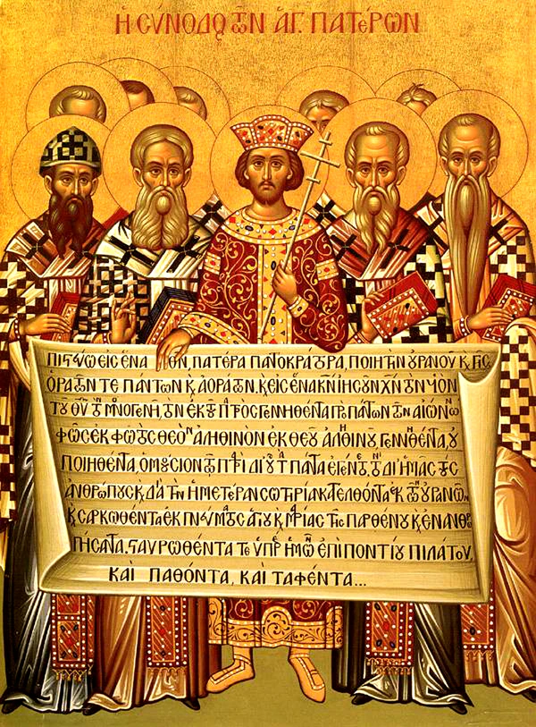 Πιστεύομεν εἰς ἕνα Θεὸν Πατέρα παντοκράτορα, πάντων ὁρατῶν τε καὶ ἀοράτων ποιητήν. Καὶ εἰς ἕνα κύριον Ἰησοῦν Χριστὸν τὸν υἱὸν τοῦ Θεοῦ, γεννηθέντα ἐκ τοῦ πατρὸς μονογενῆ, τουτέστιν ἐκ τῆς οὐσίας τοῦ πατρός, θεὸν ἐκ θεοῦ, φῶς ἐκ φωτός, θεὸν ἀληθινόν ἐκ θεοῦ ἀληθινοῦ, γεννηθέντα, οὐ ποιηθέντα, ὁμοούσιον τῷ πατρί, δι' οὗ τὰ πάντα ἐγένετο, τά τε ἐν τῷ οὐρανῷ καὶ τὰ ἐν τῇ γῇ τὸν δι' ἡμᾶς τοὺς ἀνθρώπους καὶ διὰ τὴν ἡμετέραν σωτηρίαν κατελθόντα καὶ σαρκωθέντα, ἐνανθρωπήσαντα, παθόντα καὶ ἀναστάντα τῇ τρίτῃ ἡμέρᾳ, καὶ ἀνελθόντα εἰς τοὺς οὐρανούς, καὶ ἐρχόμενον κρῖναι ζῶντας καὶ νεκρούς. Καὶ εἰς τὸ Ἅγιον Πνεῦμα. Τοὺς δὲ λέγοντας, ἦν ποτε ὅτε οὐκ ἦν, καὶ πρὶν γεννηθῆναι οὐκ ἦν, καὶ ὄτι ἐξ οὐκ ὄντων ἐγένετο, ἢ ἐξ ἑτέρας ὑποστάσεως ἢ οὐσίας φάσκοντας εἶναι, ἢ κτιστόν ἢ τρεπτόν ἢ ἀλλοιωτὸν τὸν υἱὸν τοῦ θεοῦ, ἀναθεματίζει ἡ καθολικὴ ἐκκλησία. Ἀμήν.[10]