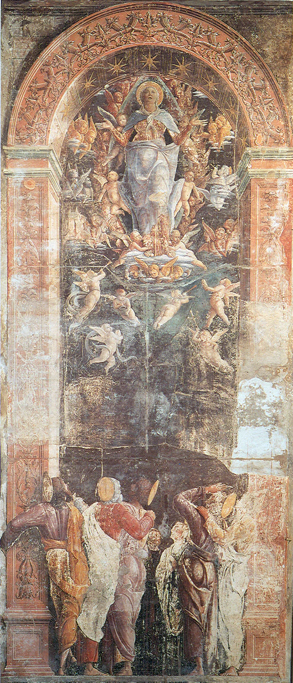 …с падуанцем Никколо Пиццоло. …Якопо Скварчоне получил заказ на роспись капеллы Святого Христофора, что в церкви августинских братьев-отшельников в Падуе, и поручил её вышеназванному Никколо Пиццоло и Андреа. Никколо написал в ней Бога-отца, восседающего во славе в окружении учителей церкви, и его росписи считались впоследствии не уступающими по качеству работам Андреа в той же капелле. И действительно, если бы Никколо, который сделал мало вещей, но исключительно хорошие, получал столько же радостей от живописи, как от игры оружием, из него вышел бы отличный художник и он бы дольше прожил на этом свете, ибо, находясь всегда при оружии и имея много врагов, он однажды, возвращаясь с работы, подвергся нападению и был предательски убит. Насколько я знаю, от него не осталось других вещей, если не считать еще одного изображения Бога-отца в капелле Урбана Префекта.