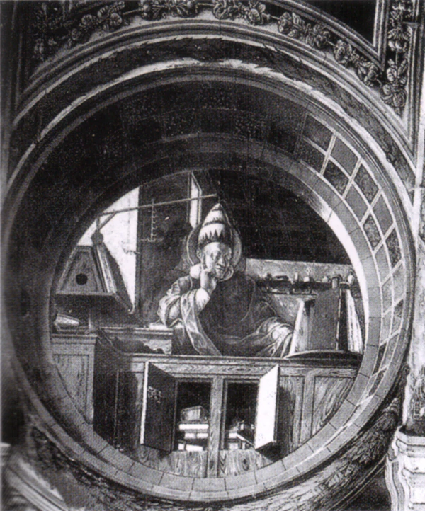 Композиции фресок художника были подсказаны ему архитектурой помещения. В центральной грани апсиды находится круглое окно, а боковые грани — сплошные. Никколо изобразил на них такие же окна, через которые зритель словно заглядывает в кабинеты богословов. Художник тщательно выписывал предметы на полках, страницы рукописи, изгибы опор книжных подставок, застежки книг, находящиеся в этих помещениях[17].