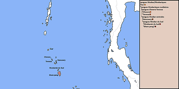 - южные никобарские языки (диалекты: Condul, Great Nicobar, Little Nicobar, Milo, Sambelong, Tafwap)
