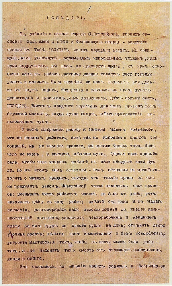 Неудачная русско-японская компания вынудила Николая II пойти на некоторые уступки либеральным кругам. 12 (25) декабря 1904 года был дан высочайший указ Сенату «О предначертаниях к усовершенствованию государственного порядка», обещавший расширение прав земств, страхование рабочих, эмансипацию инородцев и иноверцев, устранение цензуры[14]. Однако, подъём революционного движения продолжался. В январе 1905 года священником Георгием Гапоном и группой рабочих на имя императора была составлена Петиция о рабочих нуждах, в которой наряду с экономическими содержался ряд политических требований — в том числе устранение власти чиновников и введение народного представительства в форме Учредительного собрания[15].