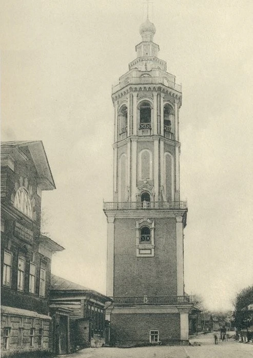 Колокольня, имевшая когда-то часы-куранты, отличается по стилю от храма. Она сохранила типичную для ярославских и суздальских звонниц XVII столетия схему высокого столпообразного восьмерика на четверике основания. Завершением колькольни является ступенчато убывающие восьмерики вместо привычного в то время шатра. В XIX веке на звоннице было 13 колоколов, самый большой из которых весил более четырёх тонн. Колокольню и второй этаж храма соединяла металлическая галерея с ажурной решёткой, существовавшая до 1779 года.