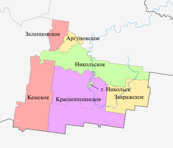 В Никольском районе 215 населённых пунктов, в том числе 1 городской (город) и 214 сельских[16].