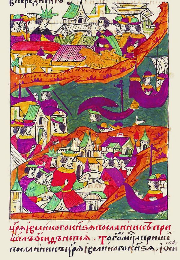 - О походах на волжских булгар, первая победа над которыми приписывается Кию (т. IX, с. 4), о том, как Владимир Святославич послал к ним философа Марка с проповедью христианства (т. IX, с. 58—59). Как указывает Б. М. Клосс, такие сведения были особенно актуальны в период борьбы с Казанским царством в первой половине XVI века.