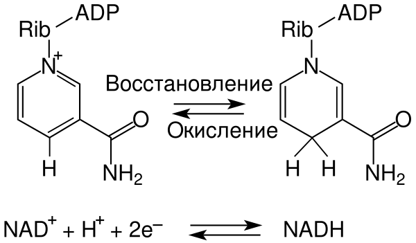 Из электронной пары гидридного иона один электрон переносится на положительно заряженный азот в никотинамидном фрагменте, а атом водорода, оставшийся после отрыва электрона от гидридного иона, переносится на четвёртый атом углерода в кольце (С4), располагающийся напротив атома азота. Стандартный электродный потенциал окислительно-восстановительной пары NAD+/NADH составляет −0,32 вольт, что делает NADH сильным восстановителем[5]. Представленная выше реакция легко обратима, при этом NADH восстанавливает другую молекулу, а сам окисляется до NAD+. Поэтому кофермент может длительно циклично переходить из окисленного состояния в восстановленное, и наоборот, при этом расходования кофермента не происходит[3].