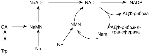 NAD+ синтезируется de novo из аминокислот, а также образуется путём реутилизации продуктов распада пиридиновых нуклеотидов.