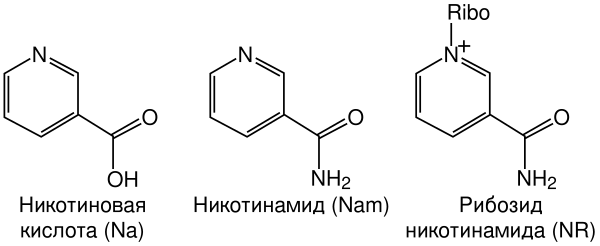 Кроме биосинтеза NAD+ de novo из аминокислот аспартата или триптофана, клетки также способны образовывать NAD+ из готовой никотиновой кислоты и некоторых её производных. Хотя известны и другие предшественники, в этих метаболических путях обычно используются три природных соединения: никотиновая кислота (Na), никотинамид (Nam) и никотинамидрибозид (NR)[4]. Эти соединения могут попадать в организм экзогенно (например, с пищей, в которой содержится смесь никотиновой кислоты и никотинамида, называемая ниацином, или витамином В3). Однако эти соединения образуются и в самой клетке, где никотинамидный остаток высвобождается из NAD+ в реакциях переноса ADP-рибозных остатков. В самом деле, ферменты, обеспечивающие образование NAD+ из готовых производных никотиновой кислоты, сконцентрированы в ядре клетки, что может компенсировать большое количество реакций, протекающих в этой органелле с потреблением NAD+[28]. Клетки также могут получать NAD+ из своего внеклеточного окружения[29].