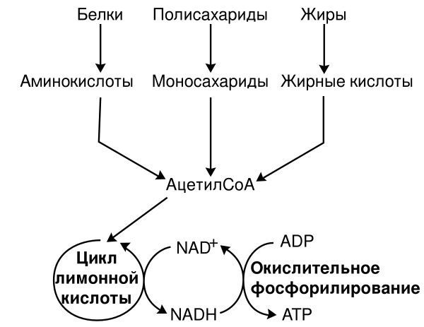 Окислительно-восстановительные реакции, катализируемые оксидоредуктазами, составляют важнейшую часть всех метаболических путей, однако наиболее значима их роль в процессах, связанных с выделением энергии из питательных веществ. В них такие восстановленные соединения, как глюкоза и жирные кислоты, окисляются и в связи с этим выделяют энергию. Эта энергия запасается NAD+ при его восстановлении до NADH в ряде реакций β-окисления жирных кислот, гликолиза и цикла трикарбоновых кислот. У эукариот электроны, перенесённые на восстановленный в цитоплазме NADH, переносятся в митохондрию для восстановления митохондриальных NAD+ с помощью митохондриальных челночных механизмов, таких как малат-аспартатный челнок[48]. Митохондриальный NADH затем окисляется белками электроно-транспортной цепи, которые накачивают протоны в межмембранное пространство из митохондриального матрикса, и благодаря энергии протонов в ходе окислительного фосфорилирования синтезируется ATP[49]. Такую же транспортную функцию челночные системы имеют и в хлоропластах[50].
