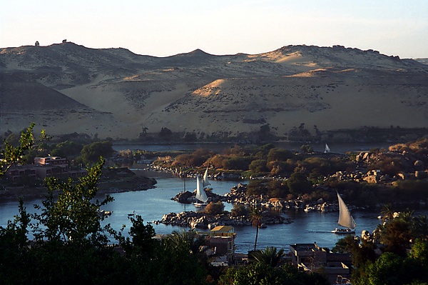 Нил течёт с юга на север. Характер течения Нила бурный, в нижнем течении спокойный. На реке расположено несколько островов: Агилкия, Биггех Гезира, Гезирет-ан-Набатат, Гезирет-Варрак-эль-Хадр, Замалек, Рода, Сехель, Саи, Гезирет-Тути, Филы и Элефантина.