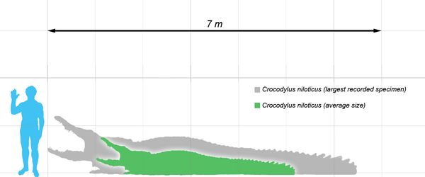 Судя по проверенным данным, единственный вид крокодилов, особи которого были измерены и превысили в длину 6,1 м — это гребнистый крокодил[34]. Но в настоящее время наибольший интерес могут представлять следующие сообщения о крупных нильских крокодилах, сравнимых по размерами с гребнистыми: