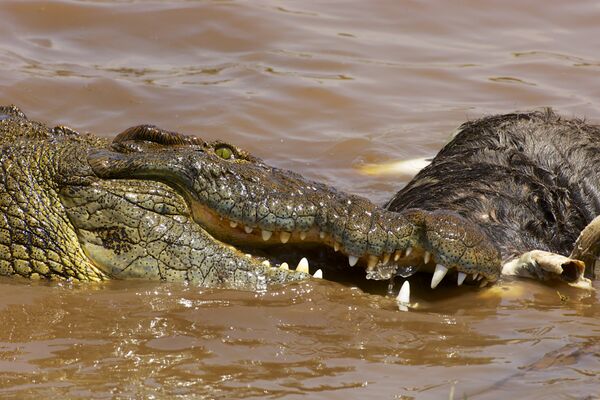 Их способность незаметно скрываться под водой, в сочетании со взрывной силой и высокой скоростью на коротких дистанциях, делают крокодилов эффективными охотниками на крупную добычу. Зубы нильского крокодила служат для того, чтобы пронзать тело жертвы и удерживать её в пасти, но они плохо подходят для разрезания шкуры и мышц. Однако это не является недостатком конструкции — огромная сила укуса и расположение зубов в центральной части пасти позволяют крокодилам буквально прорубить тело крупного животного[44][32][22]. Нередко крокодил, схватив добычу, начинает быстро вращаться вокруг своей оси (так называемое «смертельное вращение»), разрывая её тело на части. Сила сжатия челюстей нильского крокодила контролируется специальными механорецепторами, что позволяет ему эффективно контролировать захваченное животное. Жертва, как правило, умирает от повреждения черепа и позвоночного столба, разрыва внутренних органов, кровотечения или утопления, либо просто начинает поедаться живьём. Наглядной демонстрацией силы нильского крокодила будет свидетельство Альфреда Брема, описавшего, как крокодил откусил голову пришедшему на водопой быку[45]. От крупной туши крокодилы отрывают куски мяса и глотают их целиком. Несъеденные части туши крокодилы могут прятать про запас, что в свое время стало причиной появления мифа о том, что крокодилы предпочитают протухшее мясо[22][32]. Когда группа крокодилов делит добычу, одни крокодилы могут держать тушу, а другие вращаться вокруг своей оси, быстро вырывая из неё крупные куски мяса. Для этой цели одиночные крокодилы могут закреплять тушу между камнями или корягами[32][22]. Если же речь заходит о животных, которые намного меньше по размерам, чем сам крокодил, то они легко сокрушаются челюстями и просто проглатываются целиком или несколькими большими кусками.