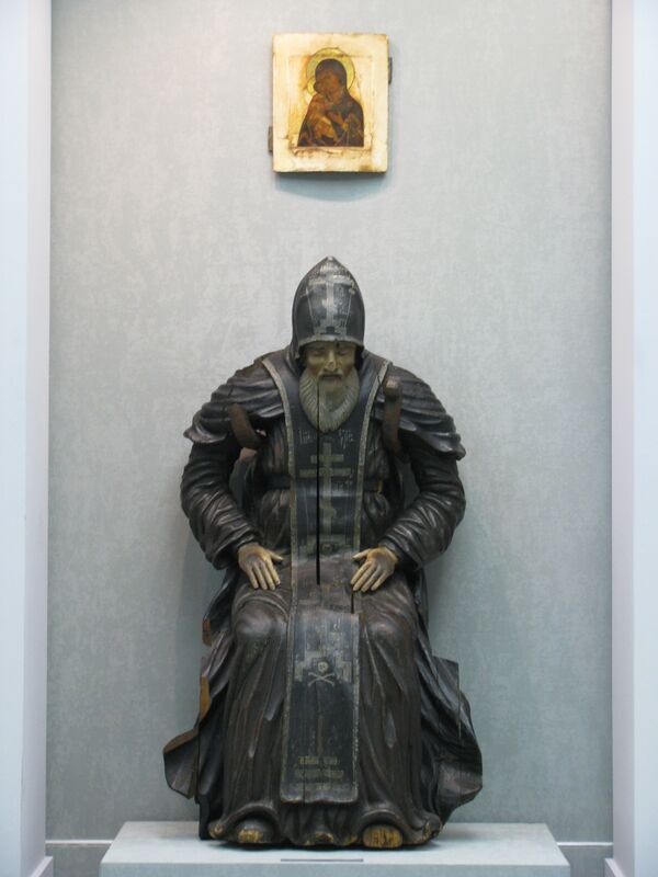 В музее «Наследие преподобного Нила», расположенном на территории Нило-Столобенской пустыни, находится изваяние «Нил Столобенский» — вырезанная из дерева и раскрашенная скульптура, почитаемая как чудотворная. Предположительно, она создана в 1770—1780-е годы. Скульптурный образ преподобного был выполнен для Покровского храма церкви Иоанна Предтечи Нило-Столобенской пустыни. Заведующая сектором научно-методической и педагогической работы Центрального музея древнерусской культуры и искусства имени Андрея Рублёва, доктор искусствоведения Тамара Барсегян предположила, что её автором мог быть лепщик, работавший над украшением храмов города Осташкова, Нило-Столобенской пустыни и Валаамского монастыря Кондратий Семёнович Конягин[7].