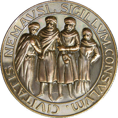 В средние века память об этом символе была полностью утеряна. На печати, скрепляющей акт 1226 года, изображены четыре городских консула в мирных одеяниях (сегодня этот символ можно увидеть на медали Учёного коллежа консулов Нима, фр. Docte collège des Consuls de Nîmes). Считается, что герб Нима в это время представлял собой щит полностью красного цвета, который символизировал принадлежность виконтам Нарбона.