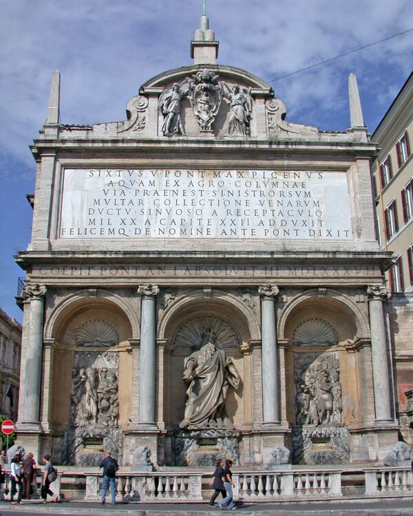 Ренессансные и барочные городские фонтаны, прежде всего фонтаны Рима, также восходят к античным нимфеям. Например, Фонтан «Аква-Феличе» (итал. Fontana dell'Acqua Felice), также известный как «Фонтан Моисея», — монументальный барочный фонтан, расположенный на Квиринальском холме в Риме, Италия. Он оформляет окончание одноимённого античного акведука, возобновлённого по велению Папы Сикста V. Фонтан в 1585—1588 годах спроектировал и построил Доменико Фонтана[6]. Античные источники имеет и знаменитый Фонтан Треви в Риме.