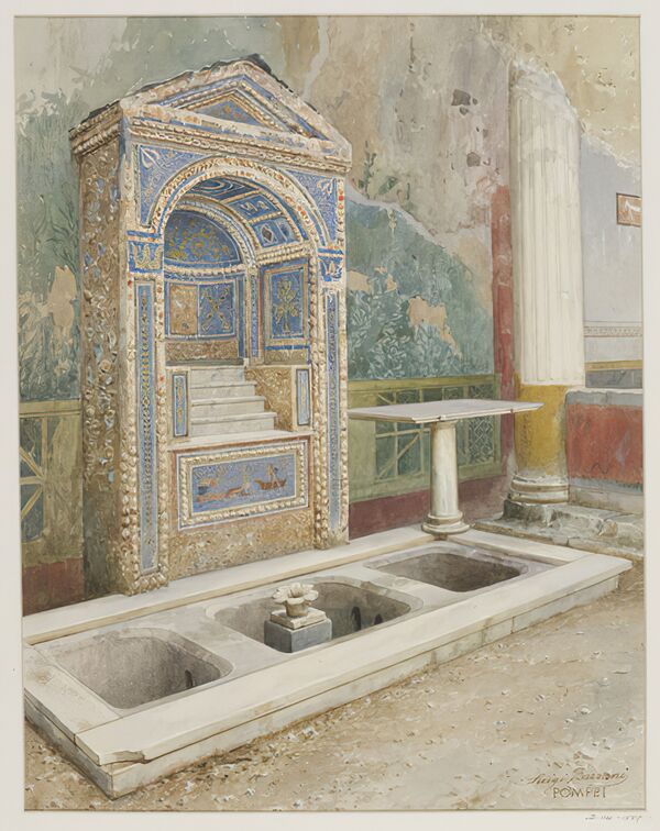 В эллинистическое и римское время лесным и озёрным нимфам стали посвящать небольшие сооружения над источниками воды — эдикулы, стелы, мраморные фонтаны, чаши и бассейны. Иногда стену или пилон оформляли нишей со статуей нимфы, фонтаном и чашей. «В I—II в. н. э. в домах римских патрициев и на помпейских виллах сооружали отдельные помещения с фонтанами, также называемые нимфеями. Фонтан давал прохладу, а небольшой алтарь служил жертвоприношениям домашним богам: ларам и пенатам»[4].